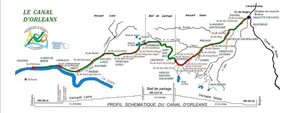 Nous allons prendre la véloroute du canal d’Orléans qui vient d’être totalement terminée. Elle longe le canal qui relie la Loire au canal du Loing et de Briare durant ses 78,65 km. Il assure ainsi la continuité par voie d’eau entre Orléans et Paris vers le nord et Briare et les canaux du Centre vers le sud. Il a été déclassé en 1954. Ce canal est à bief de partage, appelé également bief d’alimentation. Le versant Loire a une longueur de 31,81 km et le versant Seine de 27,910 km. Le bief de partage a une longueur de 18,930 km. Le dénivelé du côté Loire est de 95 m et du côté Seine de 41 m.