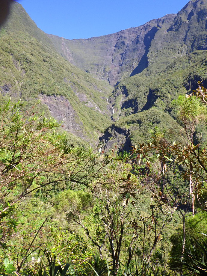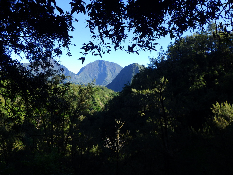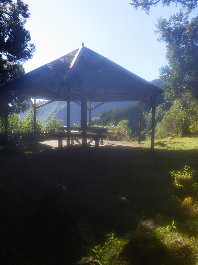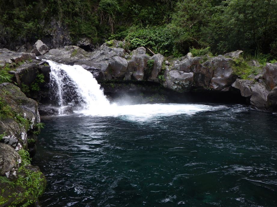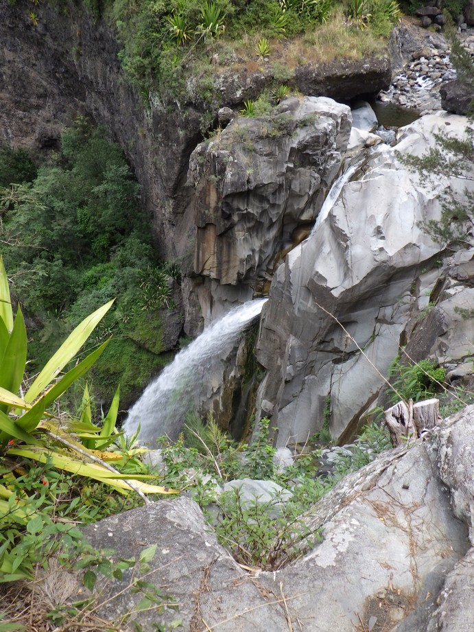 Nous décidons de faire la randonnée de la source Manouilh. Nous passons par les anciens thermes avant d’attaquer les contreforts du piton Tambourg. Arrivés au kiosque nous changeons en quelques mètres de décors et rentrons dans une magnifique forêt de cryptomérias – sapin le plus répandu à la Réunion. A sa sortie nous descendons vers les cascades qui sont situées sur la Rivière du Mât dont la source est à 2900 m sur le piton des Neiges.