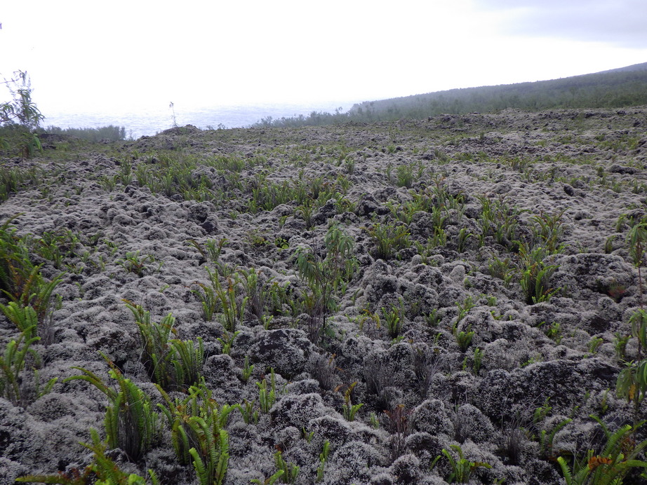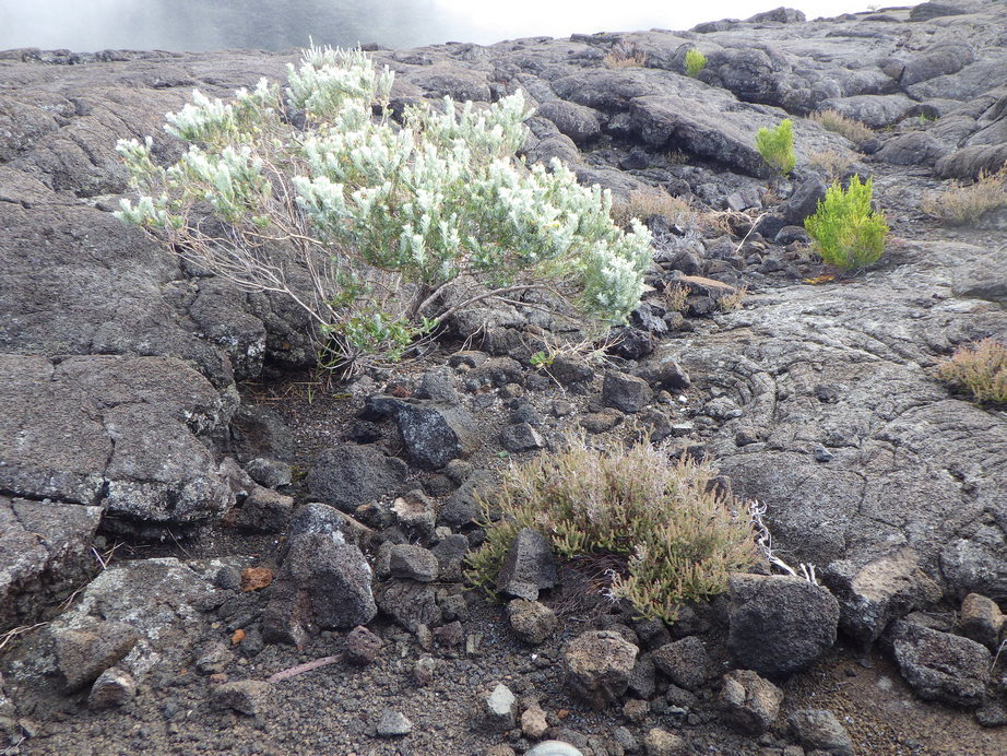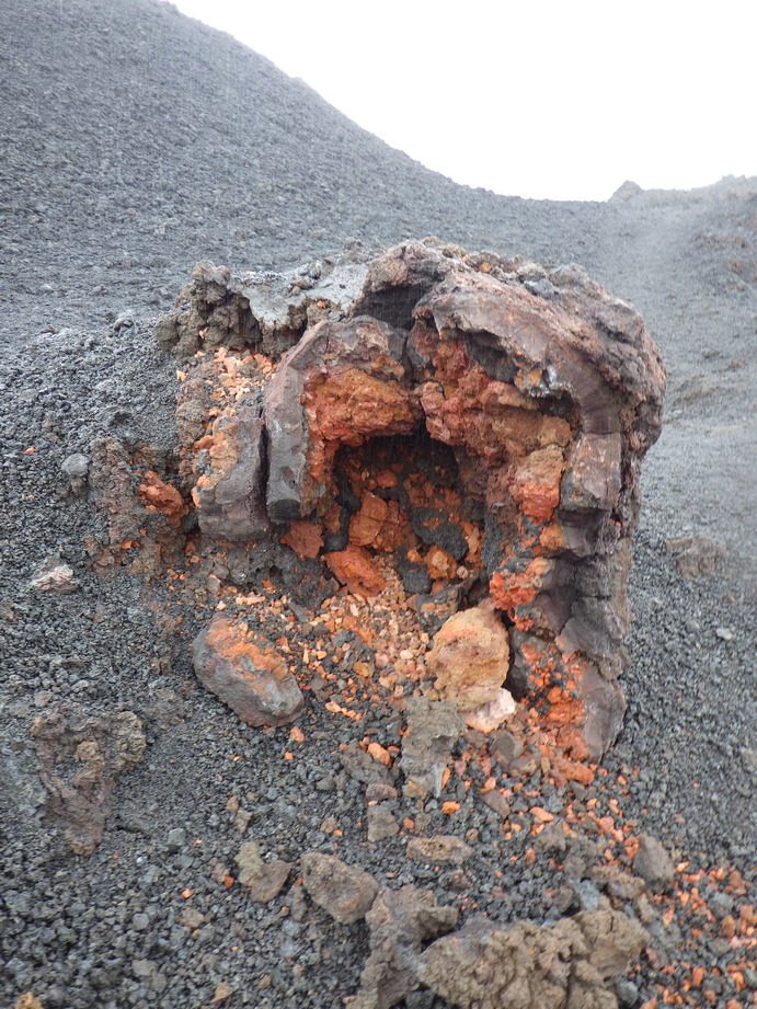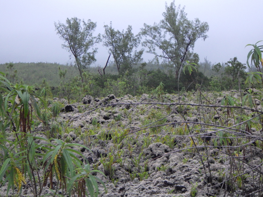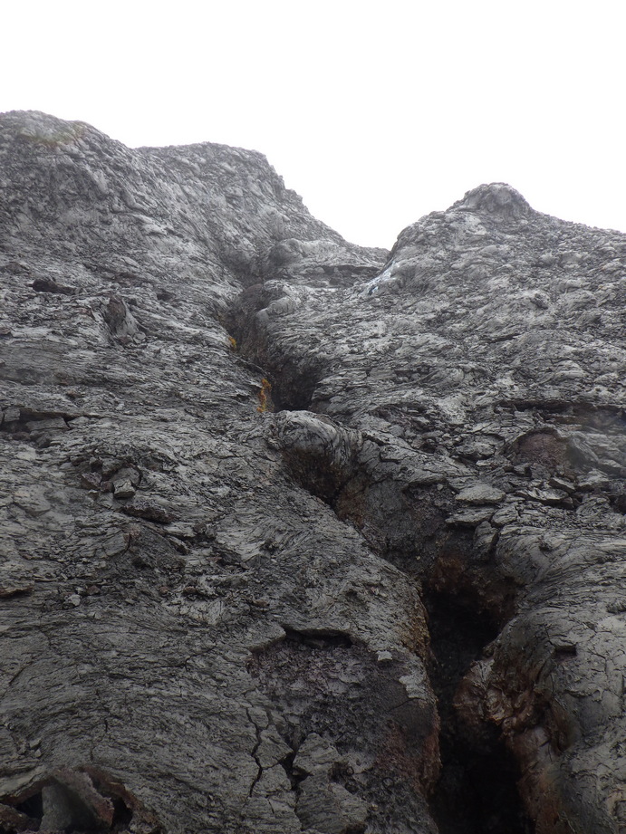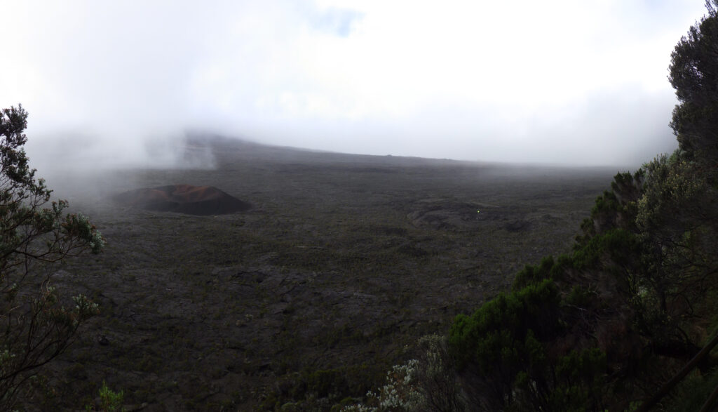 La voiture stationnée nous nous équipons de nos vêtements de pluie et nous rejoignons le Pas de Bellecombe – Jacob pour descendre dans le nord-ouest de l’Enclos Fouqué, la dernière caldeira formée par le volcan. Nous passons devant Fornica Leo qui est un volcan adventif (ou cône volcanique annexe édifié par une éruption nouvelle par rapport à la principale) du piton de la Fournaise. Nous continuons notre ascension sur une lave cordée avant d’atteindre la lave en gratton de l’éruption de 2018. Malheureusement le temps ne nous permettra pas de voir le cratère de Dolomieu qui s’est brutalement effondré lors de l’éruption de 2007 alors qu’il était entièrement rempli de coulée de lave.
