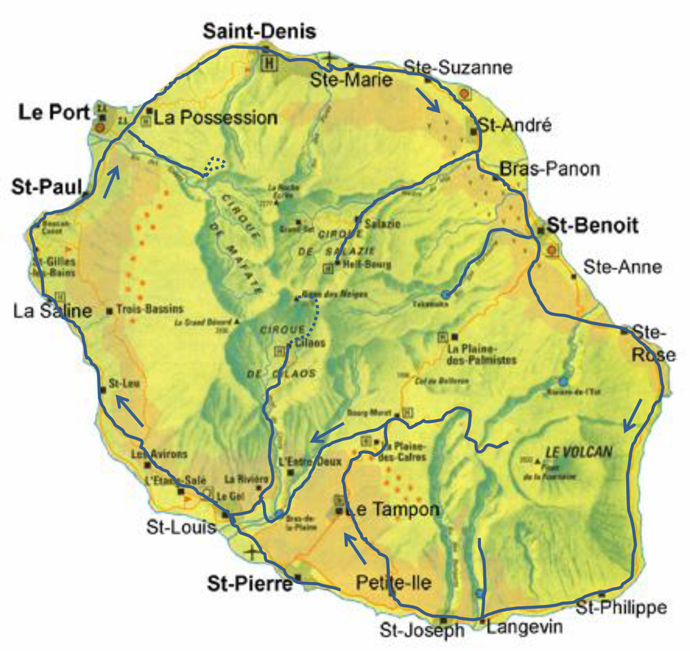 Après notre belle randonnée d’hier la journée est consacrée à aller visiter Cilaos dans le cirque du même nom et si le temps le permet de descendre juesqu’à la cascade du Bras-Rouge. Mais avant d’arriver à Cilaos il faut parcourir la route aux 400 virages qui la relie à Saint Louis, distante de 35 kilomètres, construite en 1932. Avant cette date le transport se faisait pour les plus riches en chaise à porteurs ou en chaise à bricoles.