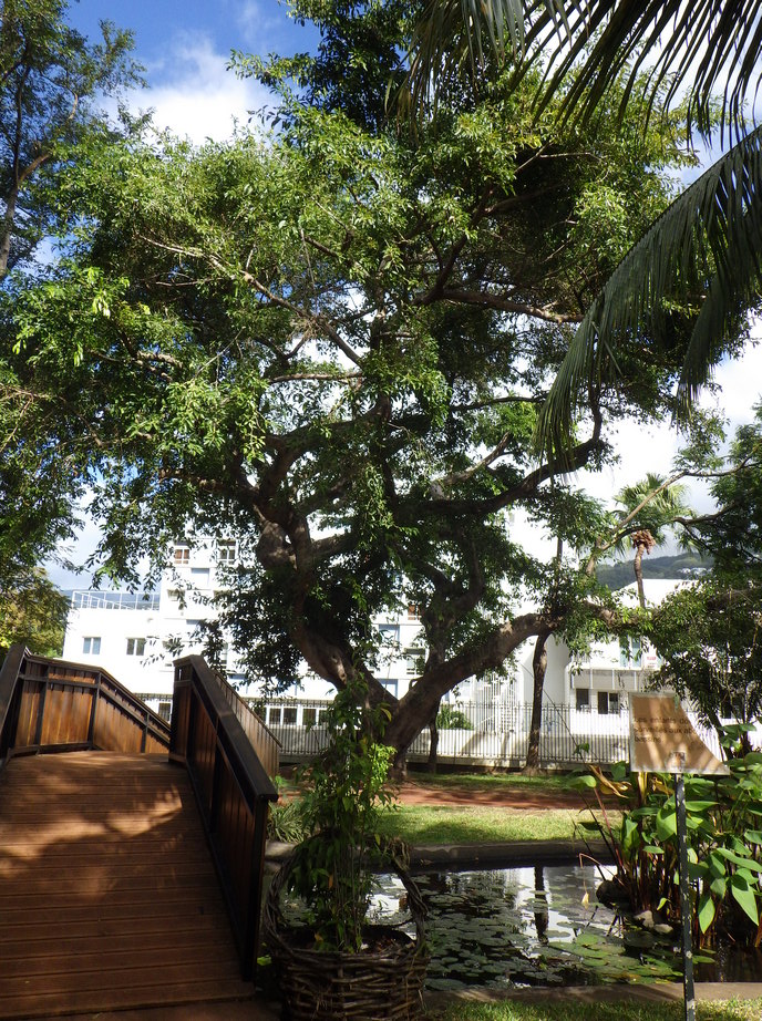Le jardin symbolise l’art de vivre à la créole avec son guétali, sa fontaine et ses allées de pierre.